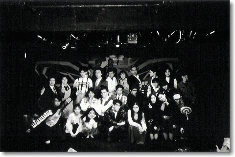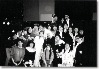 千秋楽にはアクシデントがありました。イントレで格闘するところがあった後藤君が、殴られた勢いで落っこちちゃったんです。なんとかエンディングまで持ちこたえたものの後藤君は救急車で運ばれてしまいました。しかも悪役だったのでKISSばりのメイクを したままの搬送となりました。とても貴重な体験ですよね。(なに?人事だと思って?そりゃそうですよ。)怪我は大したことはなく一安心。本当に気をつけてね。・劇団とげぬき座 「Dusky Town」 作・演出 田沢好一 1993.12.17〜19